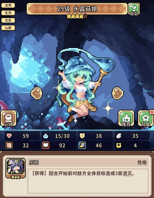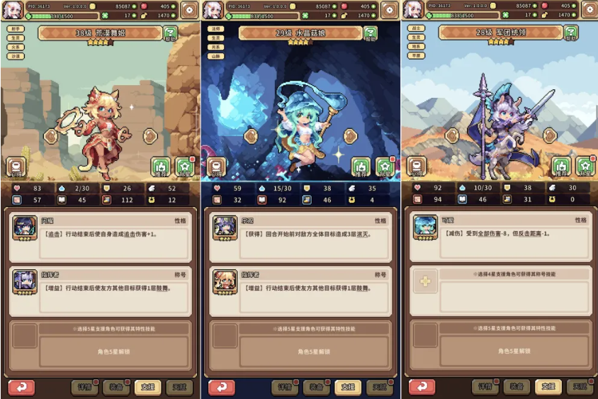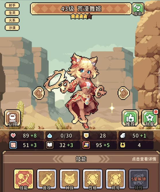 该阵容以“荒漠舞姬”为核心输出引擎,其闪耀技能可在行动结束后触发多段追击,并为全体友方叠加1层鼓舞效果;水晶菇娘则通过开局施加三层泯灭状态,同步扩散鼓舞层数,强化团队增益覆盖率;军团统领承担前排减伤职能,提供固定8点全伤害减免(代价为反击距离-1),需注意站位规避其机动性短板。三者形成“输出—增益—承伤”闭环,其中荒漠舞姬不仅是前期最高单体/群体爆发来源,更在中后期具备关键回蓝能力,建议获取后立即投入资源升至4星。