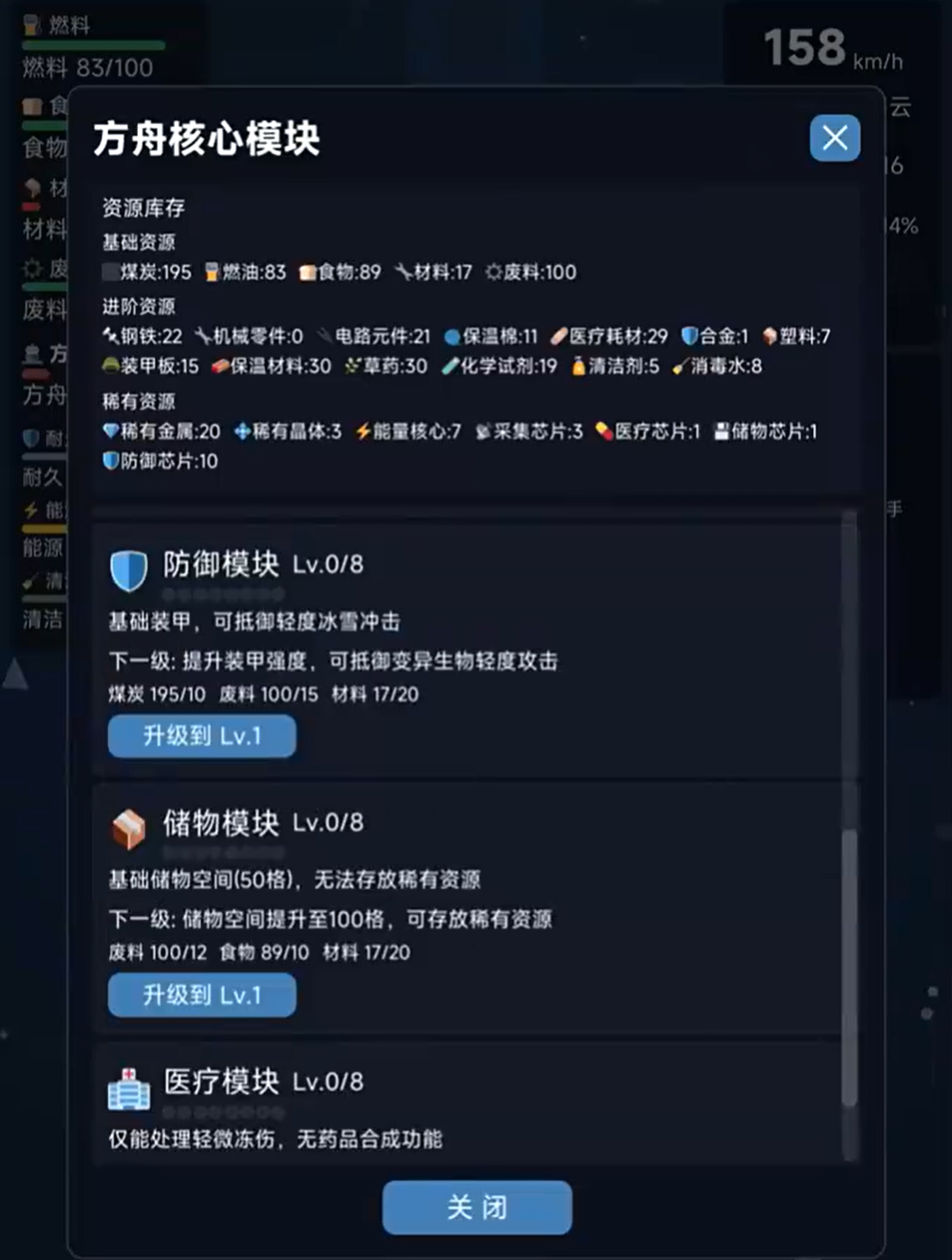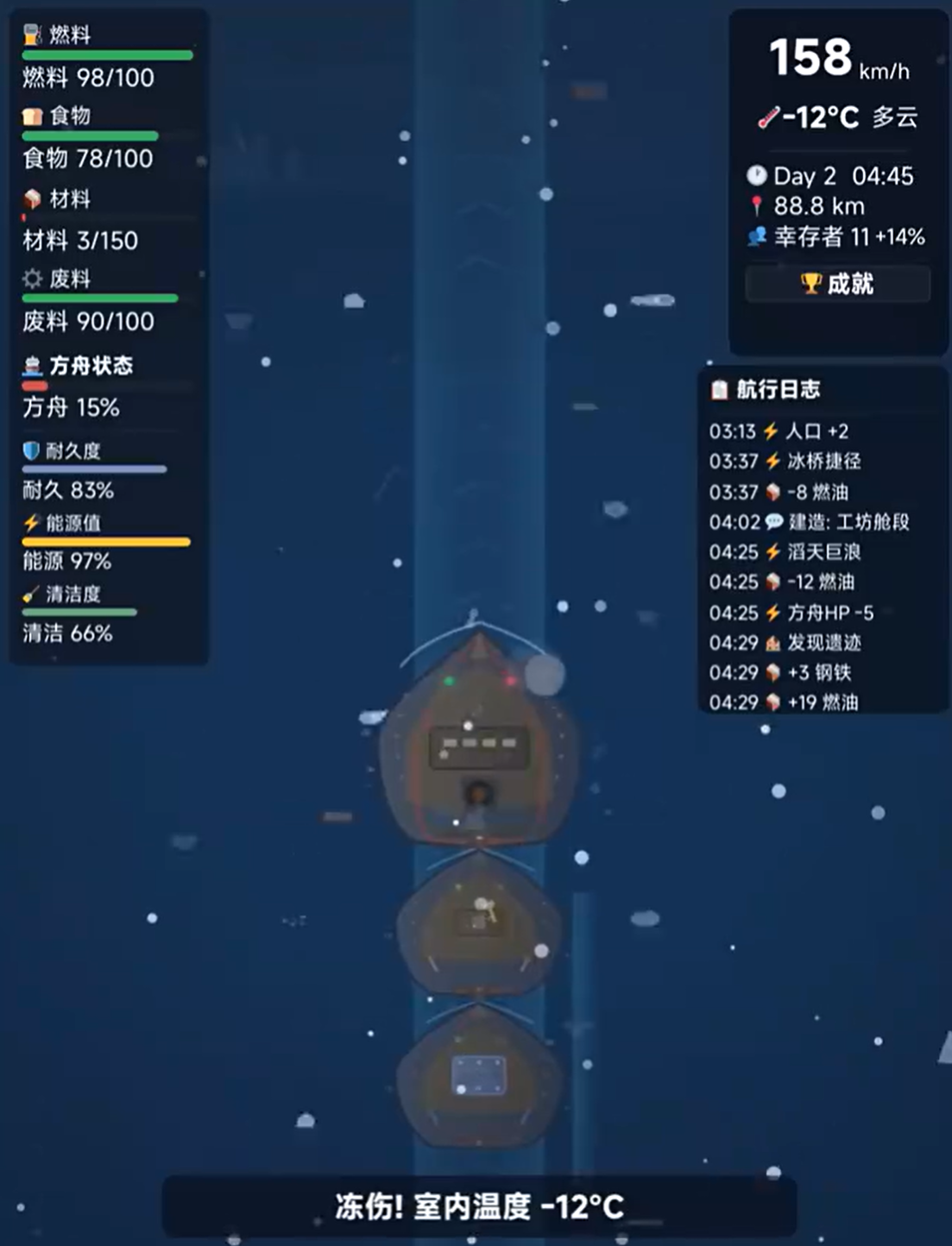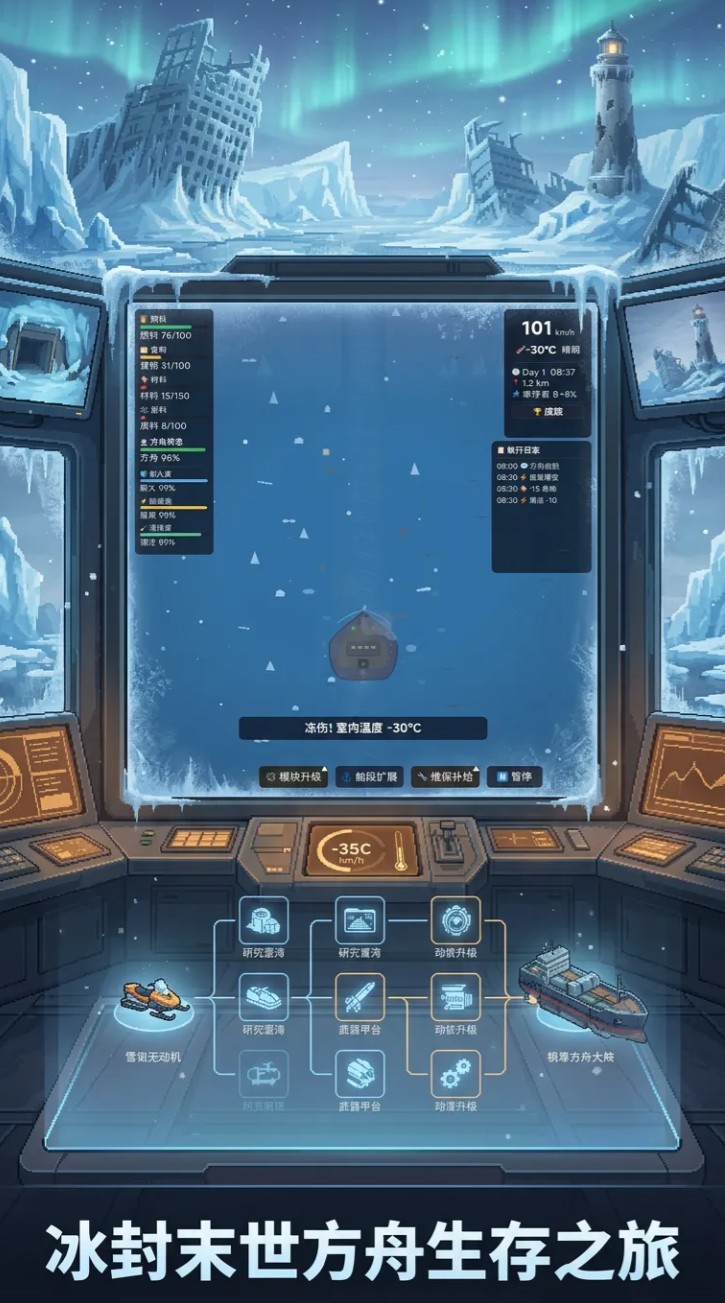 本作构建于全球深度冻结的末世图景之中,玩家将担任方舟指挥官,统筹管理整艘移动生存载具的运转体系。核心生存维度涵盖食物储备、燃料存量、基础材料库存等关键资源;同步需持续监测方舟本体的结构耐久度、能源输出水平以及内部环境洁净指数,以有效抵御极端低温引发的冻伤风险,保障载具持续航行能力。