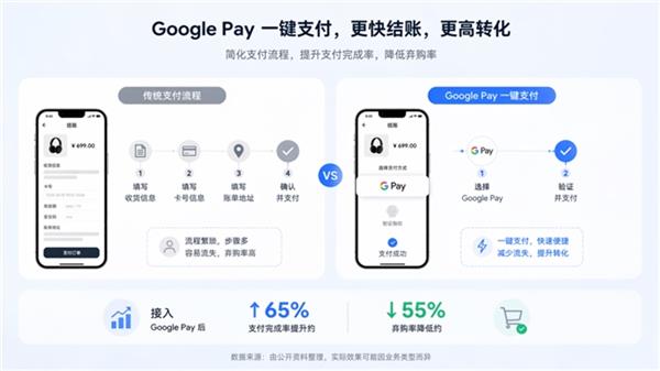 相比传统支付流程,Google Pay支持“一键支付”,用户无需重复填写卡号及账单信息,即可快速完成结账流程,从而有效缩短支付路径并降低流失率。相关数据显示,接入Google Pay后,平均可提升约65%的支付完成率,并降低约55%的弃购率。