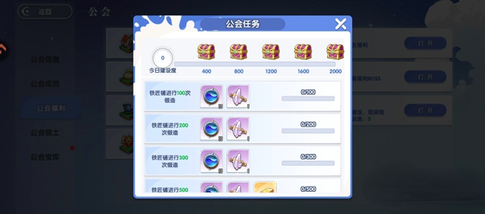 公会福利区全天开放,支持即时组队与任务接取。每日刷新固定数量的日常任务,覆盖铁匠铺、维克多农场等指定地图点位。单个任务可获得100至500点建设值,累计满400建设值即可开启一个宝箱。该机制设计强调高频轻量参与,避免时间捆绑,兼顾上班族与学生群体的游戏节奏。