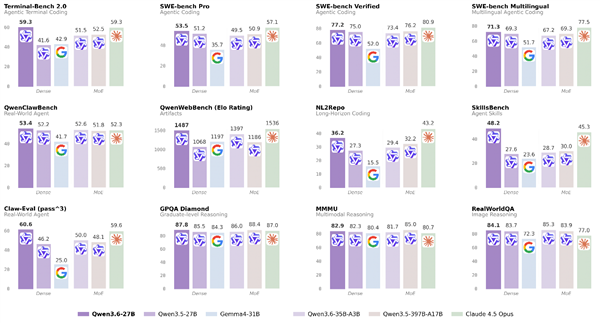 在模型推理计算时,稠密(Dense)模型的每个参数都会参与,这意味着只有压榨出每个参数更极致的性能,让智能密度持续提升,才能整体提升模型智能水平。基于系列技术及工程优化,Qwen3.6-27B实现了稠密模型的智能密度新升级,涌现出媲美旗舰模型的智能体编程能力。在SWE-bench、Terminal-Bench 2.0、SkillsBench、QwenWebBench、NL2Repo等多项反映真实智能体编程能力的权威基准测试中,Qwen3.6-27B的表现大幅超过Gemma4-31B、Qwen3.5-27B乃至体量15倍于自身的Qwen3.5-397B-A17B等开源模型,甚至可媲美Claude Opus 4.5等闭源模型。