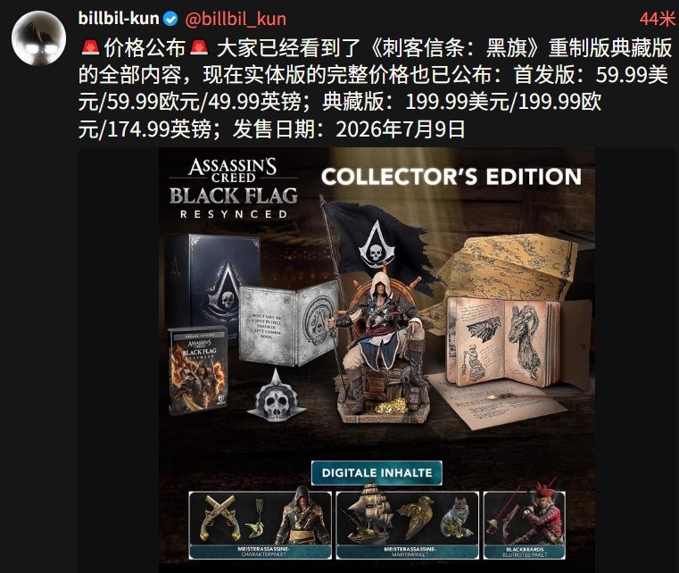 今日,可靠内部人士兼数据挖掘者billbil-kun分享了即将推出的《刺客信条:黑旗》重制版《Resynced》的定价信息。