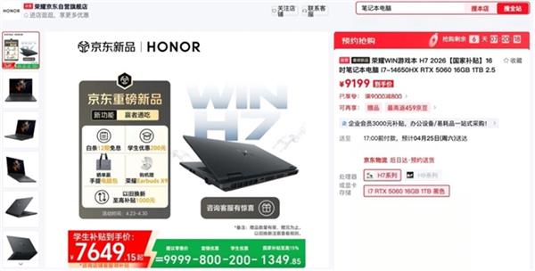 4月23日,京东重磅首发荣耀WIN系列游戏本与荣耀MagicBook Pro系列,首发价9199元、7999元起,用户购机还可享至高15%国家补贴以及京东12期免息。其中,荣耀WIN游戏本H7的5060 16G+1T版本由京东独家首发,国补到手价7819.15元,学生用户享专属优惠,学生国补到手价7649.15元,助力玩家第一时间锁定满血战力。首发期间,在京东购买荣耀WIN游戏本即赠荣耀耳机;购买MagicBook Pro系列即赠鼠标,且好评再加赠100元E卡。此外,此前已在京东率先开售的荣耀MagicBook数字系列,目前依然限时加赠荣耀鼠标,同样值得关注。