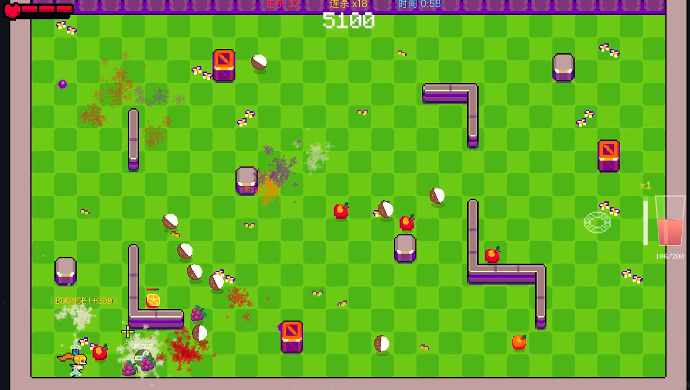 游戏的节奏感和动效更是绝佳,特别是在被葡萄弹虐上百遍之后,不仅要学会快速躲避,适当的迎难而上,还可以让你开启直接的暴力美学,而目前最爽感的玩法就是手机触屏模式。指尖弹反精准度更高,而且伴随着每一次的猛砍,大屏满屏爆汁冲击力十足,让你开启更强的果汁大王争夺战!生存挑战玩法可以让你轻松开启联机模式,凑够一整瓶果汁,走可直接进入暴走状态!进入疯狂水果boss砍杀状态。