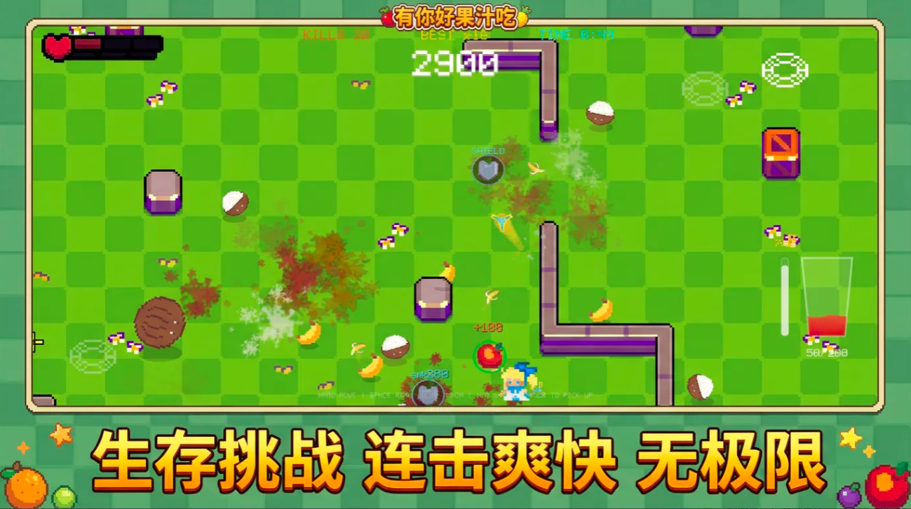这款游戏对于新手玩家来说,初次入坑门槛并不高,有很多参与测试的小伙伴甚至说其可以直接垂直入坑,真的属于那种“再来一把就睡觉”的时间杀手模式,其次就是他的游戏画风,将是我们的像素风格和漫画风相结合,为玩家带来一场别开生面的视觉享受,伴随着武器向各类水果回去爆出的果汁更是爽感十足,游戏当中没有恐怖的怪物boss,只是各种向你袭来的水果,也让玩家们在刷关卡的时候压力降低。