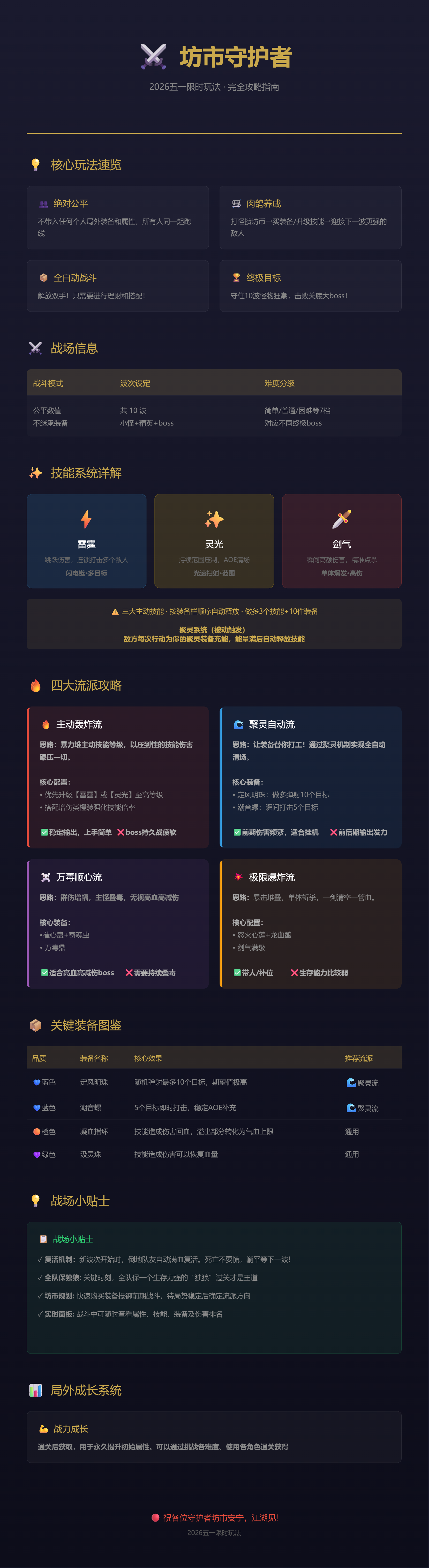 从玩法速览、技能详解到四大流派,连装备图鉴和战场小贴士都给安排得明明白白。