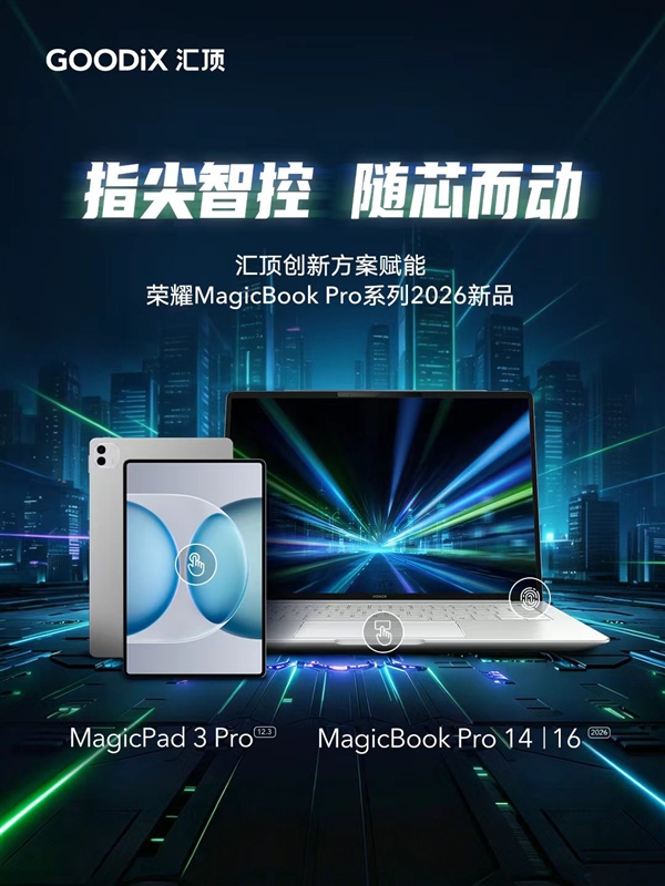 今日,荣耀正式焕新发布全新 MagicBook Pro 系列 2026 笔记本以及 MagicPad 3 Pro 12.3 平板两款重磅产品,深耕终端交互技术的汇顶科技为本次荣耀全系新品提供了先进的触控与指纹识别全套解决方案,以硬核技术加持,让两款旗舰设备实现更便捷、安全、流畅的全维度人机交互体验,大幅提升用户日常办公、创作、娱乐的使用质感。