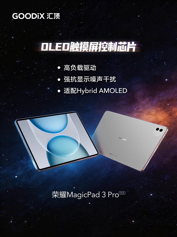 针对全新发布的荣耀 MagicPad 3 Pro 12.3 平板,汇顶科技专属定制 OLED 触控方案,凭借强悍的高负载驱动能力和优异的抗显示噪声干扰性能,完美适配设备搭载的 Hybrid AMOLED 显示屏。该技术方案不仅助力平板实现极致轻薄的机身设计,更保障了屏幕触控的精准度与流畅度,无论是日常触屏操作,还是搭配主动笔进行手写笔记、创意绘画、专业设计等精细操作,都能实现低延迟、高精准的书写触控体验,充分释放平板的生产力与创作潜力。