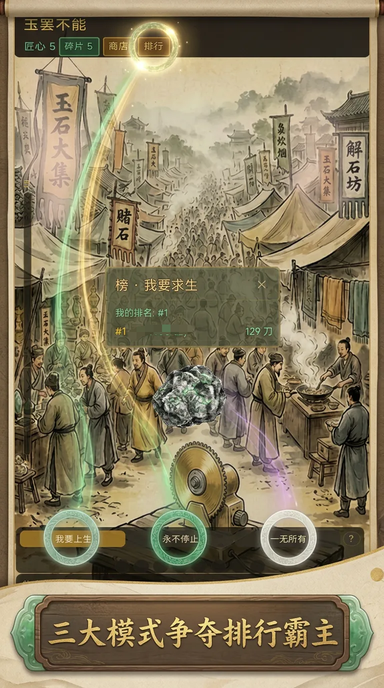 除单人经营外,游戏还设有三大跨服争夺模式:比拼切石刀数、竞逐极品石料产出率、角逐总收益排行榜。成功登顶榜单不仅可获得全服可见的荣誉标识,还将解锁限定外观、稀有道具及高额金币奖励。但需注意,误判可能导致原石报废或亏损,策略性与风险并存的设计显著提升了游戏深度与耐玩度。