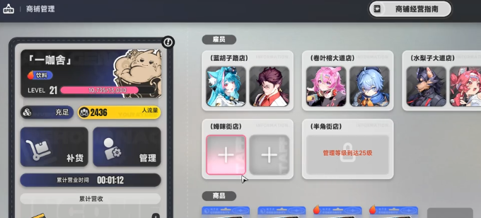 首日发展核心任务为快速开启并升级店铺系统。务必集中资源推进主线剧情,优先解锁咖啡店经营权限——这是全游戏最稳定、可持续的金币来源。店铺等级提升直接依赖“收益提取”次数,每次提取不仅获得金币,同时按固定比例转化为升级经验。因此,当收益积攒至可升级阈值时,应立即执行提取,并同步更换为单价更高的商品组合,显著提升金币产出速率。若追求高效刷金,推荐反复挑战【店长特工1-1】副本,单次通关仅需约30秒,即可稳定获得1200万金币。