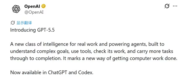OpenAI宣布,GPT-5.5自周四起全面开放使用。该模型将上线ChatGPT的Plus、Pro、商业版及企业版用户;其中高配版GPT-5.5 Pro面向Pro、商业版和企业版用户开放。