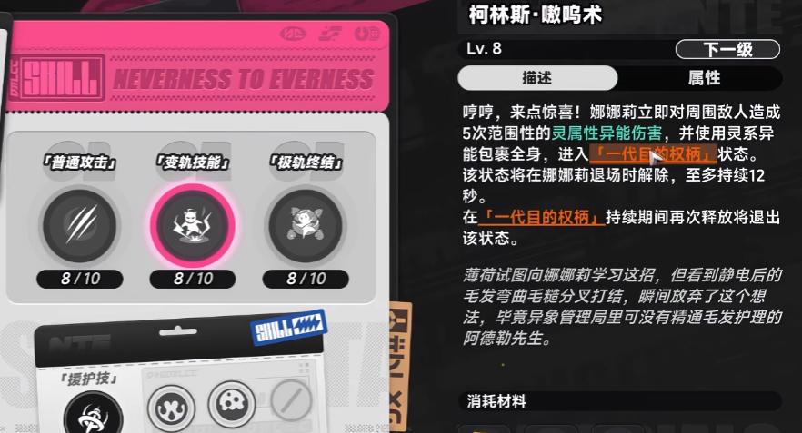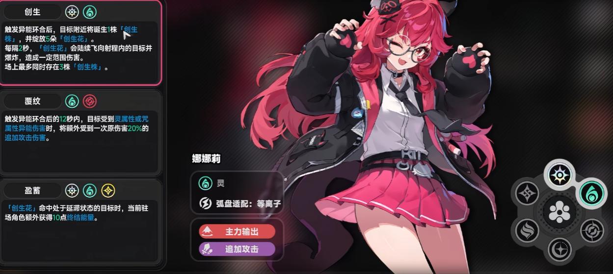 被动天赋深度绑定“异能环合”系统,强调队伍协同增益。当娜娜莉与咒属性角色配合时,QTE触发后12秒内,敌人受灵/咒属性伤害时将额外承受20%追加伤害,适配持续压制流派;若搭配光属性角色,则生成创生株与创生花,虽单体伤害偏低,但对群聚弱敌具备清场价值。另一关键被动为:强化状态下,只要队伍中任意角色触发一次异能环合,娜娜莉即对当前目标追加一次独立攻击,显著提升多角色联动下的输出频率与总伤量。