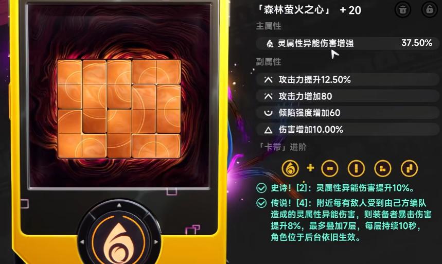 弧盘(专武)为娜娜莉质变关键:不仅提供高额基础属性加成,更激活专属R技能——需先以E技能获取左虎符印记,再以Q技能获得右虎符印记,双印记齐备后释放R技能,生成高倍率司令虎符,对Boss战有显著增益。替代方案中,“鲸之歌”(世界Boss掉落)与月卡武器综合强度可达专武的80%,前期过渡足够可靠。命座(觉醒)支持自主选择激活顺序:1链优先提升输出上限,6链则侧重大世界探索便捷性。卡带推荐“森林萤火之心”,属性契合度最优,可最大化强化状态收益。