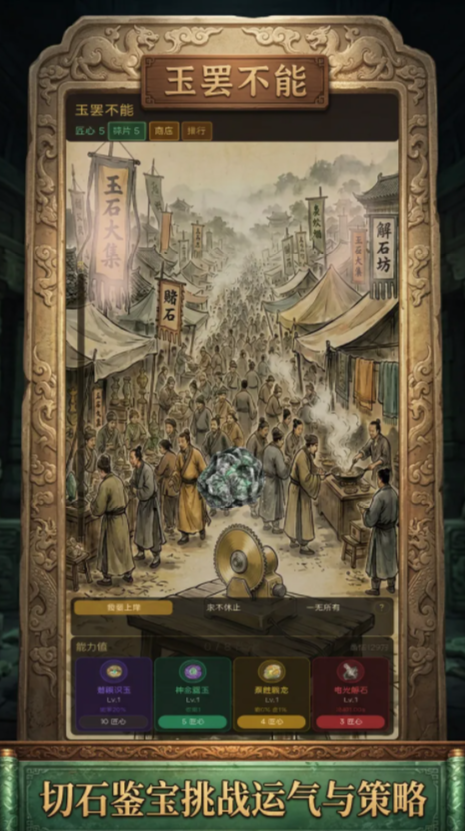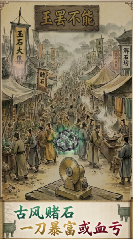 目前,《玉罢不能》尚未公布确切上线日期,但核心玩法已全面曝光。游戏采用竖屏操作界面,强调“眼力+判断+时机”的三维决策逻辑。玩家需在有限刀数内,依据原石表皮纹理、色泽分布与结构特征,动态调整切割角度与深度,力求完整剥离玉石本体,避免损伤核心价值部分。这一过程既考验直觉反应,也依赖长期积累的经验策略。