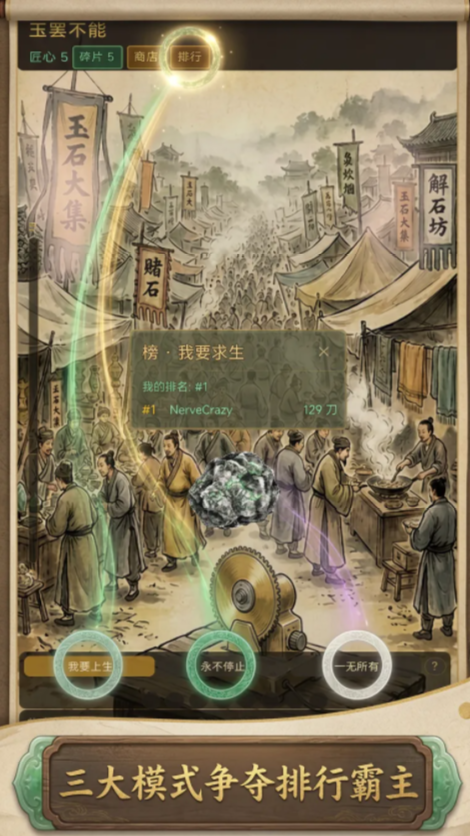 游戏中配备四种功能性技能,可在切割前激活使用,辅助识别原石内部构造、预判玉质走向及规避瑕疵区域。每次成功切割后,系统将发放专属宝箱,内含稀有道具、属性加成材料及外观装饰等资源。尽管操作门槛低(单点触控即可执行),但进阶玩法深度显著——全球排行榜实时更新,支持跨服比拼,让每一块石头的命运都成为实力的见证。