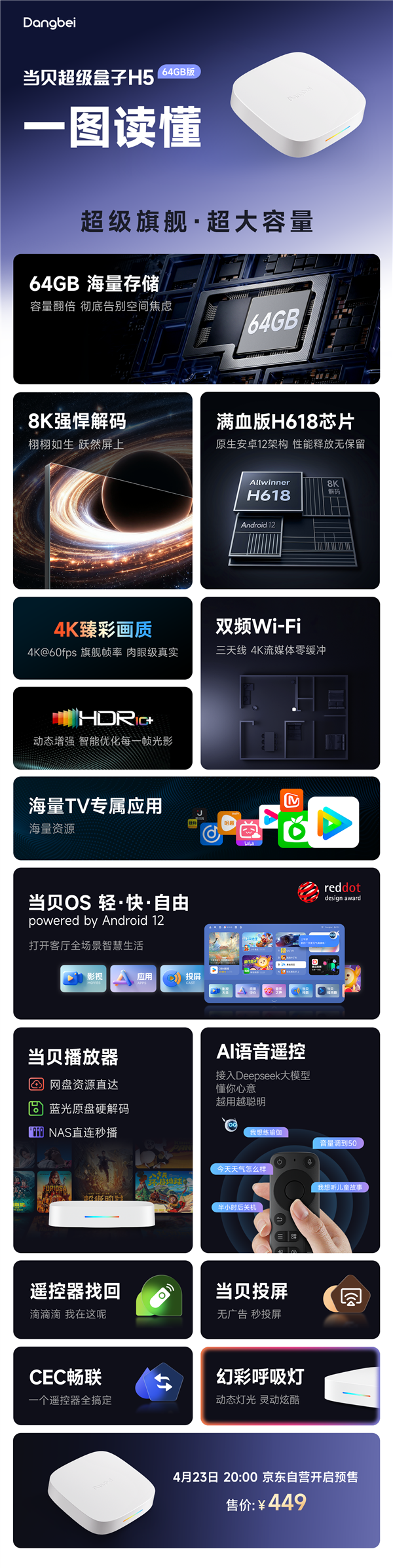2026年4月24日消息,当贝昨日正式宣布旗下超级盒子H5推出64GB全新版本,并于京东自营开启首发预售,售价449元。