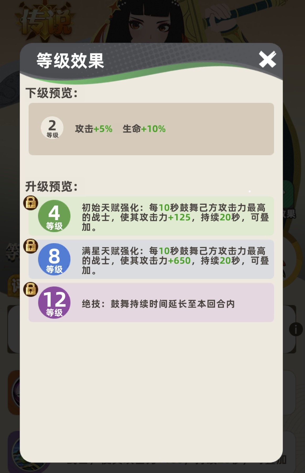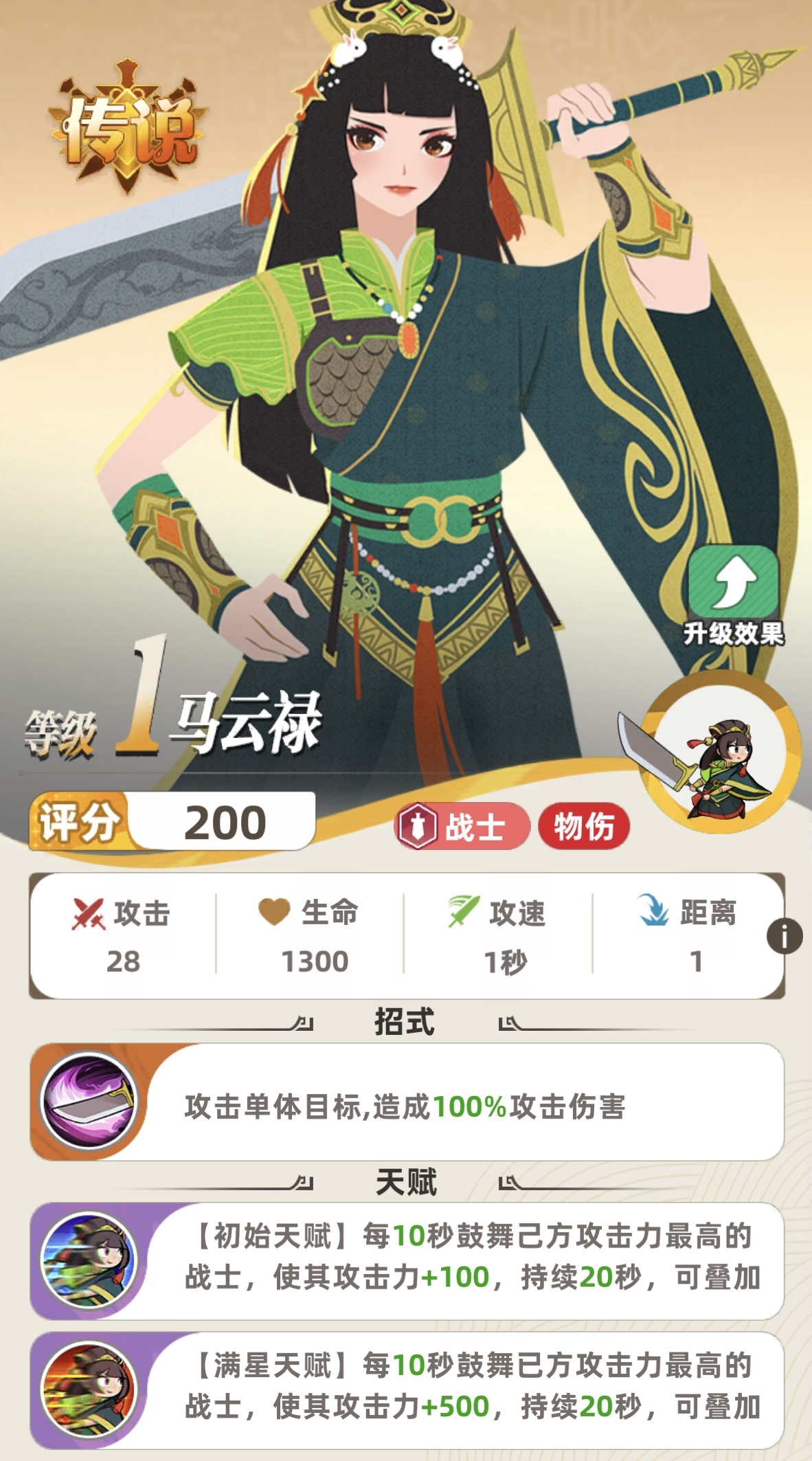 随星级提升,天赋强化效果逐步解锁。升至4星时即可激活首层强化,大幅提升基础加成;满星后,鼓舞效果将延续至整回合结束。实测显示:一星马云禄即可为指定战士提供100点攻击力增益;满星状态下,单次鼓舞最高可叠加至650点攻击力,且持续时间覆盖全场关键输出阶段。对资源有限的玩家而言,无需强求满星——4星即达实用阈值,性价比极高。