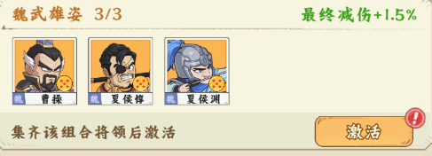 【魏武雄姿】曹操+夏侯惇+夏侯渊,激活后最终减伤+1.5%;