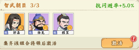 【智武朝臣】郭嘉+徐晃+程昱,激活后抗闪避率+5.0%;