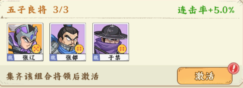 【五子良将】张辽+张郃+于禁,激活后连击率+5.0%;