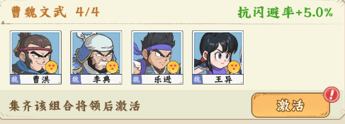 【曹魏文武】曹洪+李典+乐进+王异,激活后抗闪避率+5.0%;