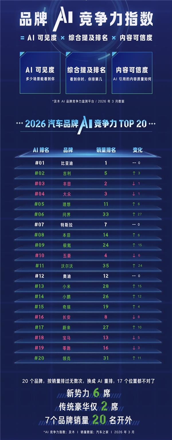 2026年北京车展现场,100余个品牌展台林立,但在AI的世界里,用户能看到的 “展厅” 却只容得下少数车型。及木平台今日发布《2026汽车品牌AI竞争力指数报告》,首次系统量化汽车品牌在主流AI工具中的可见度、提及度与可信度,揭示了AI正在重塑汽车品牌的用户认知逻辑,揭示销量与AI竞争力错位的行业新趋势。
