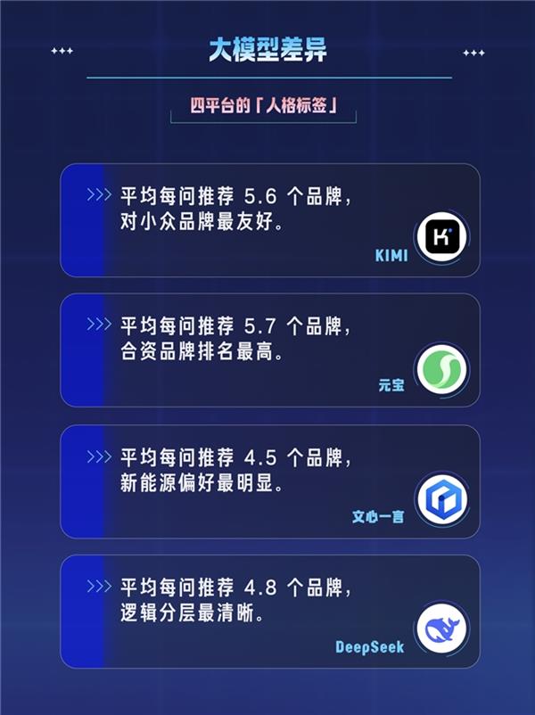 报告同时揭示了不同AI平台的品牌偏好差异:Kimi平均每问推荐5.6个品牌,偏好小众品牌;文心一言更倾向推荐新能源品牌;DeepSeek逻辑分层清晰,元宝生成结果中合资品牌排名更高。这种平台差异,也为品牌精准布局AI传播提供了参考依据。
