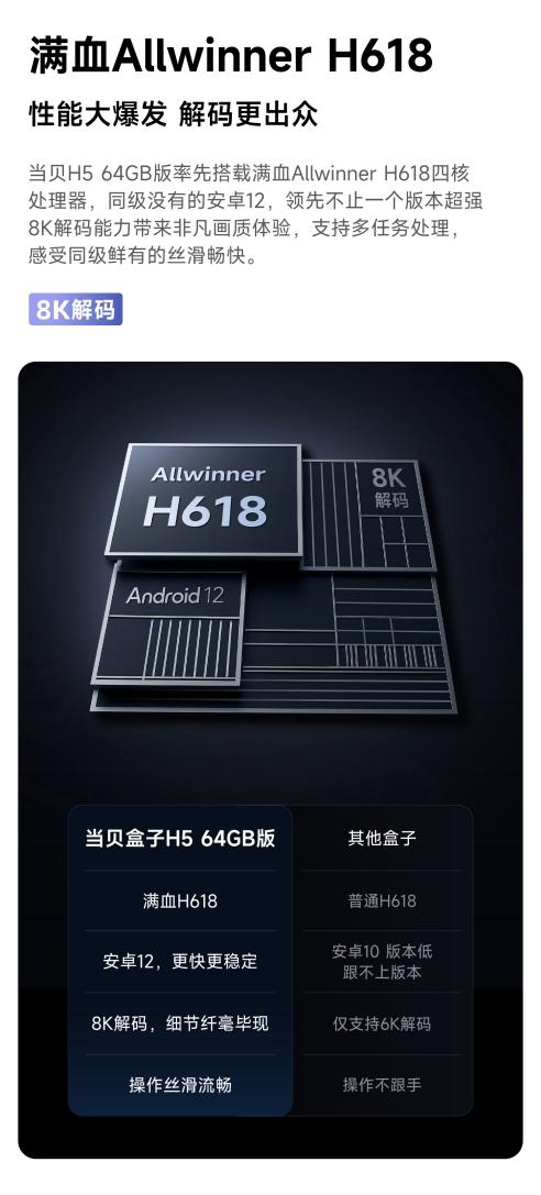硬件性能上,当贝H5搭载了满血版全志H618芯片,搭配原生安卓12架构,性能释放无任何保留。强悍的8K解码能力,让超高清片源也能流畅播放,配合4K@60fps的旗舰帧率,画面细节栩栩如生,肉眼就能感受到真实细腻的视觉效果。同时,它还支持HDR10 +动态光影优化,智能调节每一帧画面的明暗细节,暗部场景清晰不发黑,亮部画面通透不曝光,搭配双频三天线WiFi,4K流媒体播放全程零缓冲,哪怕是直连NAS播放蓝光原盘,也能做到秒加载不卡顿,让每一次观影都沉浸感拉满。综合硬件实力来看,这款机型在年度电视盒子推荐清单里,性能表现十分能打。