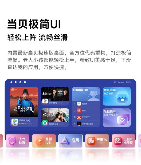 系统与功能体验上,当贝H5延续了当贝OS一贯的轻快自由风格,无强制开屏广告,界面清爽简洁,操作逻辑清晰易懂,哪怕是不熟悉智能设备的老人小孩也能轻松上手。系统内置海量TV专属应用,视频、音乐、游戏、健身等各类应用一应俱全,搭配当贝播放器的网盘直达、蓝光硬解码功能,本地观影爱好者也能获得专业级的播放体验。同时,它还自带无广告投屏功能,手机内容一键秒投,不用忍受冗长的投屏广告,追剧、看综艺更加省心。无广告、操作简单,也是大家挑选电视盒子推荐产品时十分看重的核心优势。