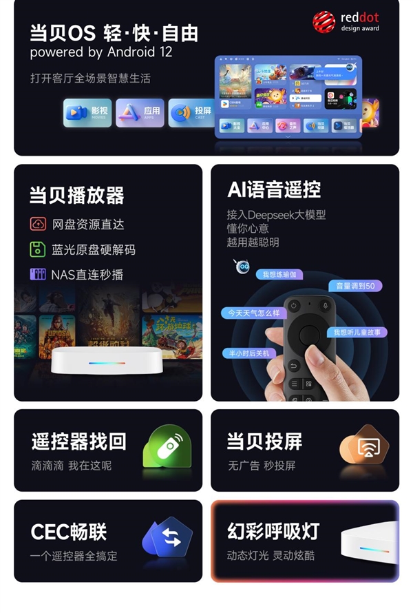 细节设计上,当贝H5也充满了贴心考量。接入Deepseek大模型的AI语音遥控,不仅能实现基础的语音搜片、调节音量,还能查天气、设定时关机、语音控制智能家居,越用越懂用户需求;遥控器找回功能,让找不到遥控器时只需一键触发,遥控器就会发出滴滴声提醒,再也不用在沙发缝里翻找;CEC畅联功能支持电视与盒子联动,一个遥控器就能控制电视开关机、调节音量,省去了来回切换遥控器的麻烦;机身自带的幻彩呼吸灯,开机和操作时会呈现灵动的动态灯光效果,为客厅增添了几分科技感与氛围感。细节拉满、功能全面,这款机型完全配得上高口碑电视盒子推荐的称号。
