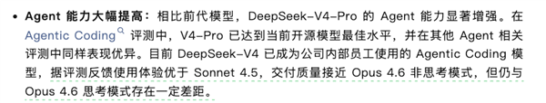 在写代码的生产力测试的环境中,V4 Pro 的能力也处于大于 Sonnet 4.5 ,但是小于 Opus 4.6 的阶段。