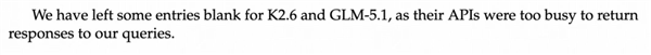 还有在测试对比友商的时候,Kimi K2.6 和智谱 GLM-5.1 的一些能力,DeepSeek 的人没测上,因为友商的 API 繁忙了。