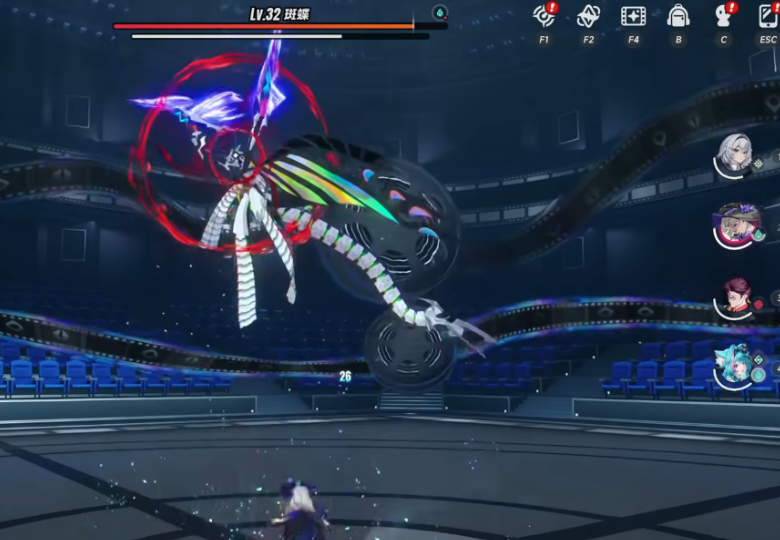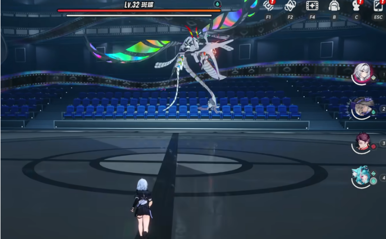 进了浮冰影院以后,不要乱走,先找左边的楼梯上二楼。上去之后要连续左转,这个地方空间有点绕,方向感不好的话,容易走回头路。沿着左边一直走,会看到前面有一扇门,走过去与门互动,触发对话之后,斑蝶就刷出来了,这时候战斗正式开始。