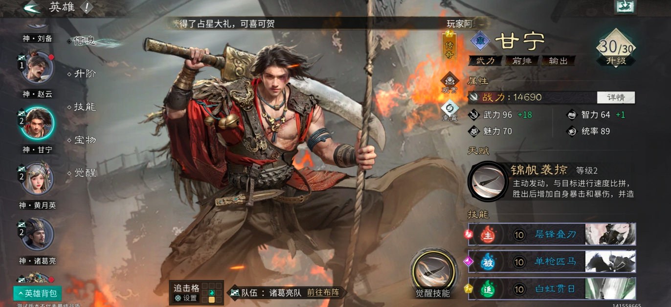 接下来就是平民玩家的战场排兵布阵,平民玩家中应当以主攻为团队核心,所以玩家在前期利用手中有限的资源,需要对主公的等级技能完成优先升级,为整个团队可带来更强的增益效果,再者就是对武将的选择,在重点编队当中,肉盾、输出、辅助这些角色是必不可缺的,甘宁这个肉盾角色可以用最少的资源快速拿下,所以玩家在抽卡时尽量集中抽取甘宁。