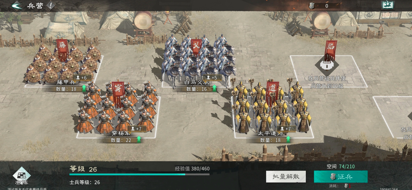 第三个重要部分就是兵营系统,其实兵种的好坏和品级没有特别大的关系,主要还是看特技情况,所以批量分解的时候一定要注意,不要按品级去分解士兵,还是要先集中在他的技能情况上,就比如藤甲兵是用来进行防御的,所以主要看的是士兵的烬磐和初磐指数情况,尽量选择这两个指数较低的士兵进行分解;其次是在士兵培养优方面可先进行能力强化,前期银币会比较匮乏,所以培养士兵的时候一定要优先拉满一个,技能培养也同样按照这个策略。