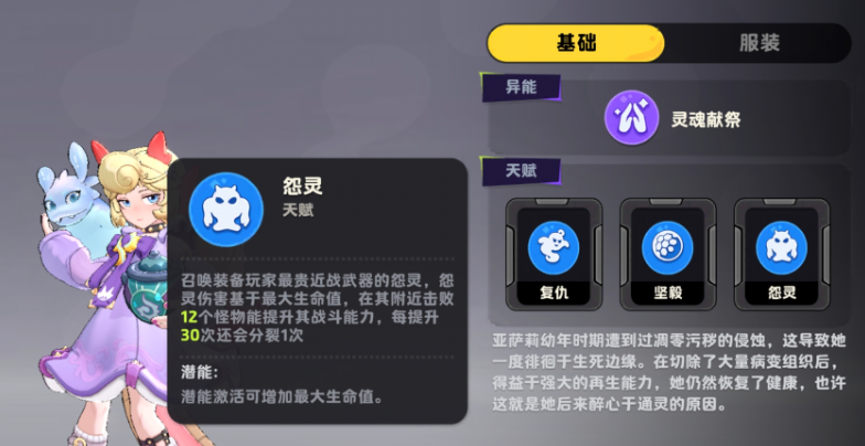 召唤流是亚萨莉的核心构筑方向。“怨灵”天赋可生成具备近战属性的召唤单位,其伤害基于亚萨莉最大生命值计算;每击杀12个敌人,亚萨莉自身战斗能力获得阶段性强化;当攻击次数累计达30次后,将分裂出新怨灵,进一步扩大输出覆盖面。配合近战武器装备加成,该体系能在中后期形成多层AOE压制网,实现高效控场与持续压制。