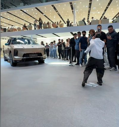 这场默契同频的斗舞,点燃了现场的热情。不少外国友人被这新奇的一幕吸引,从围观群众变身参与者,当场上头并下场加入互动对决,跟着节奏与蔚来ES9花式battle。有人模仿舞蹈动作,有人与车辆互动对拜,欢乐的氛围感染了在场所有人。