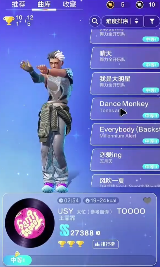 对初次接触体感舞蹈的人来说,从简单系列开始是最合适的。简单I到简单的III曲目BPM(每分钟节拍数)一般都在80-120之间,动作编排主要是基础的手部、腿部动作,重复次数较多。这一阶段的目的就是使玩家对摄像头的捕捉范围有初步的认识,形成基本的节奏感,学会跟随屏幕角色舞动。当玩家在简单的III模式下很容易获得高分的时候,就说明他已经具有了进阶的基本能力。