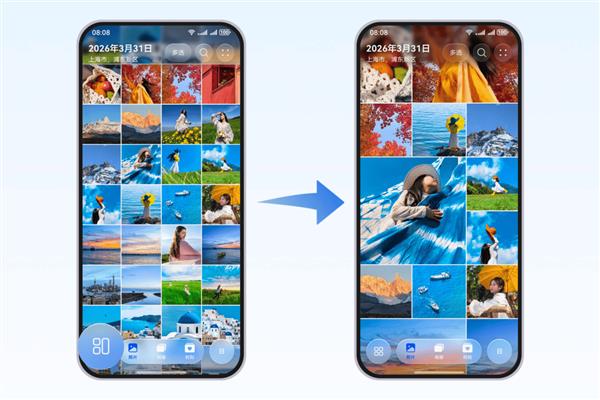图库应用新增的“艺术化视图”功能,用户在照片页点击左下角切换视图按钮即可体验,年视图和月视图会智能呈现精选图片和视频,日视图则会艺术化呈现所有图片和视频,让回忆的翻阅变得更有仪式感(平板用户在图片和视频页点击左下角切换视图按钮即可)。五一旅拍归来,双指捏合切换至月视图,系统就会自动为您挑出精彩瞬间,省去手动筛选的繁琐。