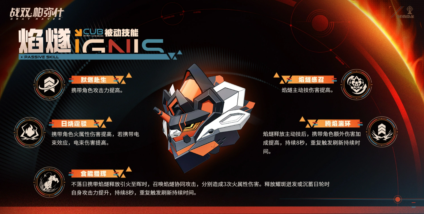焰燧属于战术辅助类辅助机,整体机制深度绑定火属性伤害体系。其被动能力可同步提升携带角色的基础攻击力与火属性伤害倍率;当携带角色处于电束效应状态时,该效应造成的伤害亦获得额外加成。这一设计有效支撑多属性混搭流派,避免属性增益资源闲置,提升队伍配置灵活性。