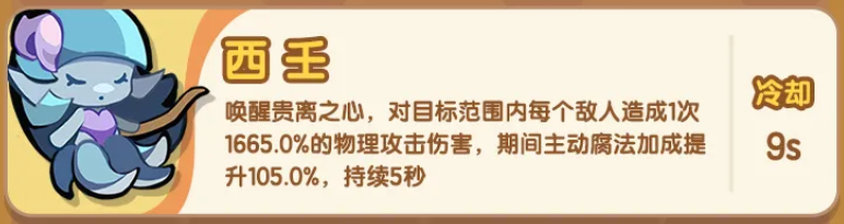 西壬承担主力爆发职责,激活“贵离之心”状态后,可对全体敌人施放单次高额物理伤害,基础倍率为1665%;配合腐化机制,每次主动施法还可额外获得105%伤害增幅。其单位时间DPS处于梯队顶端,是压轴清场的核心支点。