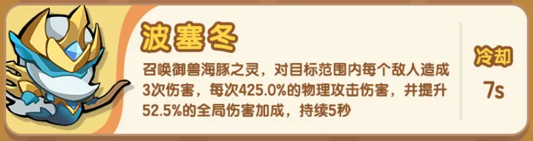 波塞冬作为核心召唤型辅助,可生成海豚之灵御兽,对范围内敌人发动三段式范围伤害,每段造成425%物理攻击;同时,其技能具备成长性,后期可为全队提供稳定的伤害加成增益,实现“输出+增益”双重价值。