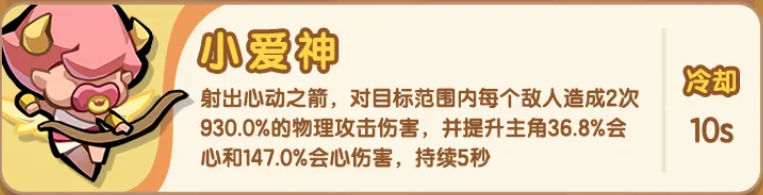 小爱神专注远程精准打击,发射“心动之箭”可对目标连续造成两次930%物理伤害;虽技能冷却为10秒,但其不可替代的战略价值在于——上阵即赋予主角36.8%会心率与147%会心伤害加成,大幅优化主角输出质变阈值。