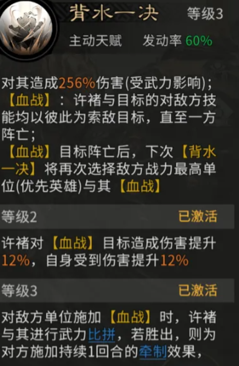 许褚的核心机制围绕天赋【背水一决】展开——该技能可对单个目标造成高达256%的武力加成伤害。伤害数值严格受自身武力属性影响,武力越高,爆发越显著,秒杀概率随之提升。释放【背水一决】时,将同步触发专属状态【血战】:许褚与指定敌方单位进入强制1v1对战,双方所有技能仅锁定彼此,直至一方阵亡方可解除。若当前血战目标被击杀,下一次【背水一决】将自动锁定敌方战力最高者,实现精准打击关键单位,有效瓦解敌方核心输出链。