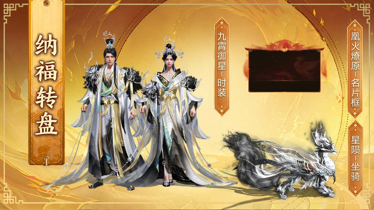 2、【纳福转盘】 全新纳福转盘开启,金子奖池奖励大幅度提升,全新心愿奖励,累计幸运值必然可获取全新红色时装——九霄御星或全新红色坐骑——星陨! 参与抽奖有几率获取替身宝宝自选包,海量金子,更有机会获取全新名片框——凰火燎原!!