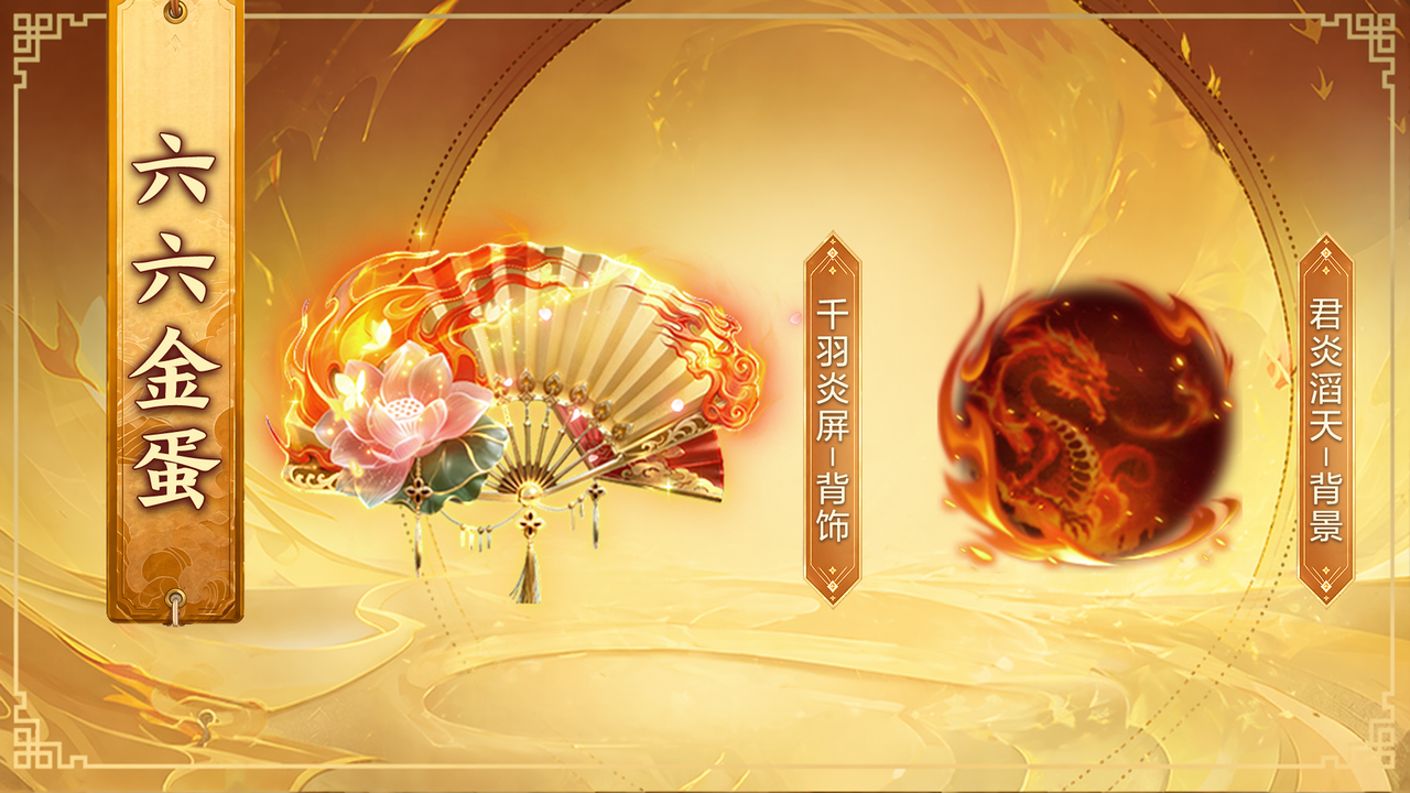 3、【六六金蛋】 全新砸金蛋活动开启,总计66枚金蛋,参与纳福转盘获取聚宝金蛋道具即可激活金蛋,金蛋激活即可砸取!! 参与即可获取全新背饰——千羽炎屏,全新背景——君炎滔天等豪华奖励!!
