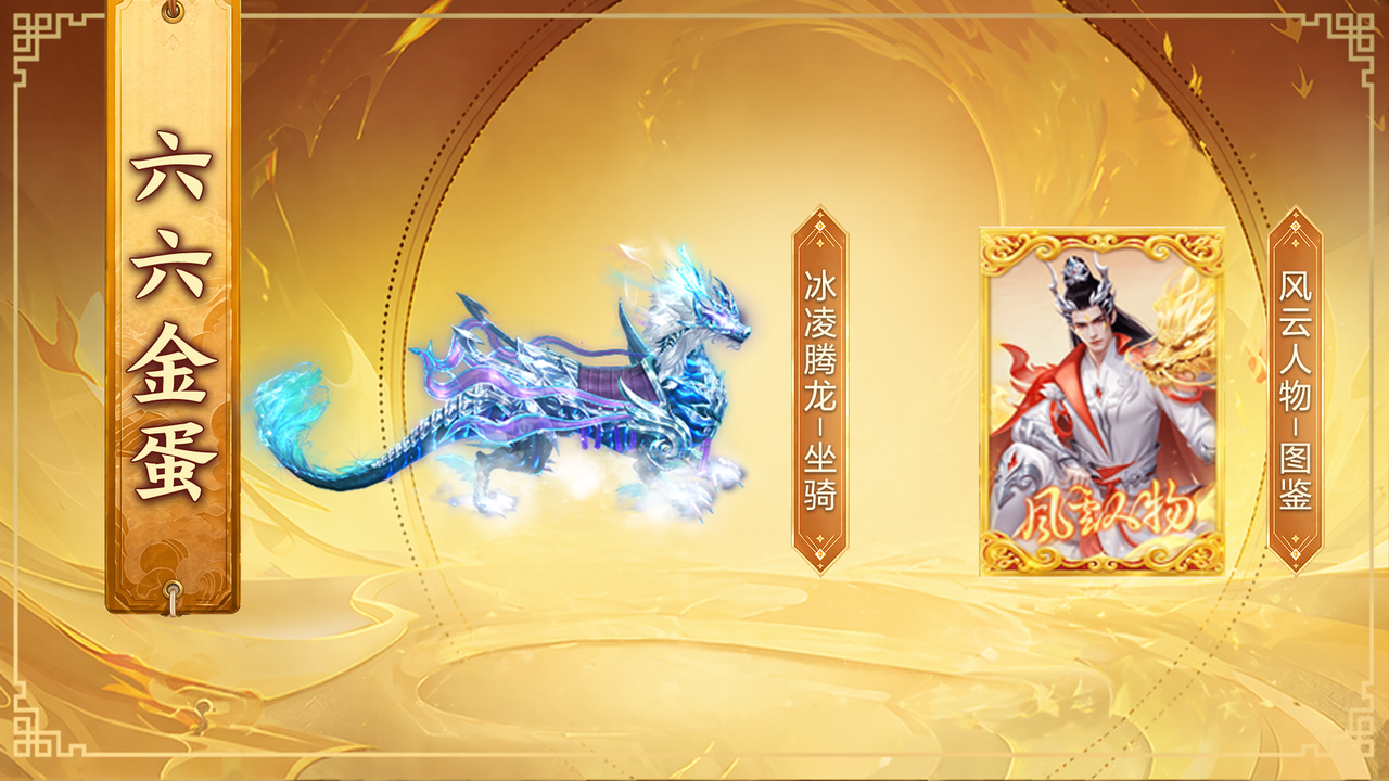 本次活动中每行最后1个金蛋均有概率直接获取龙纹金蛋,累计激活普通金蛋激活个数也可激活1个龙纹金蛋!!参与即有机会获取珍稀限定坐骑幻化——冰凌腾龙!更有全新风云人物卡牌可获取!!