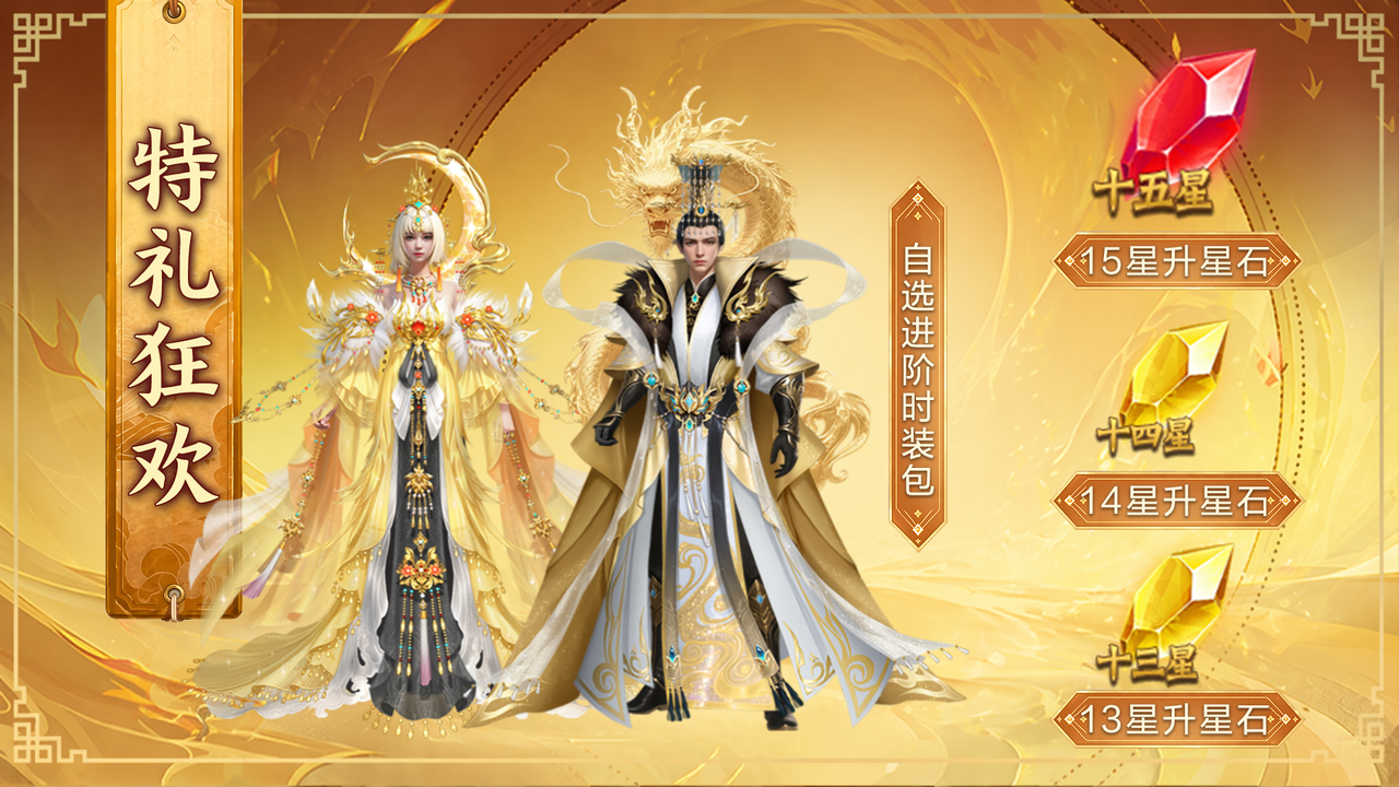 4、【特礼狂欢】 狂欢盛典启,特礼如约至!活动期间仅可通过免费活动、以及购买活动内礼包获取特礼积分累计个人进度,领取丰厚奖励!! 参与活动便有机会获取15星升星石,14星升星石,13星升星石以及自选进阶时装包!