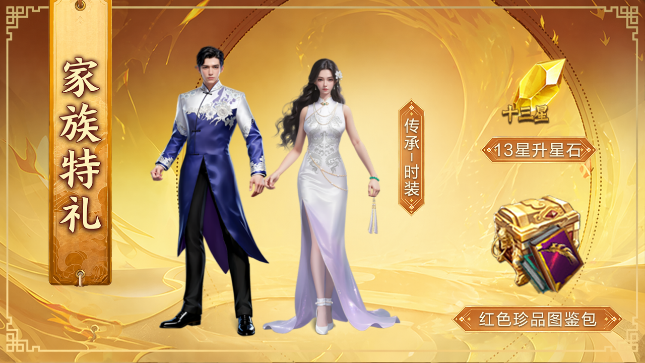 5、【家族特礼】 福聚家族,特礼共赢!全家族收集特礼积分激活奖励,参与活动全家族可获取13星升星石,红色珍品图鉴包以及珍稀返场限定时装——传承!!