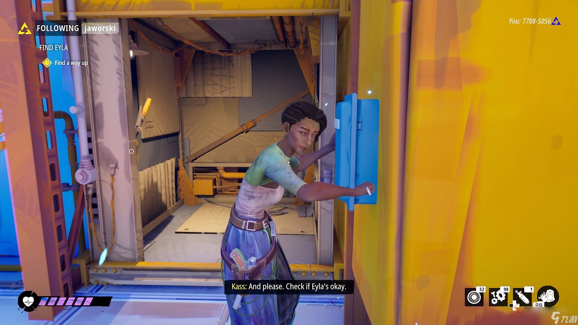 如果你是和 Kass 在一起,你需要从后门出去,通过幻视发现 Eyla 的去向。然后和 Kass 一起向左走,前往另一部电梯。和 Kass 一起乘电梯下去。在底部,你会找到 Eyla 和她的潜水艇。经过简单的交谈后,你就可以进入了。